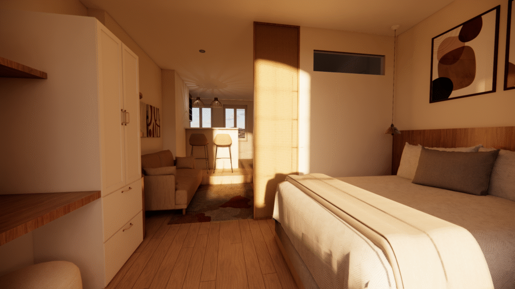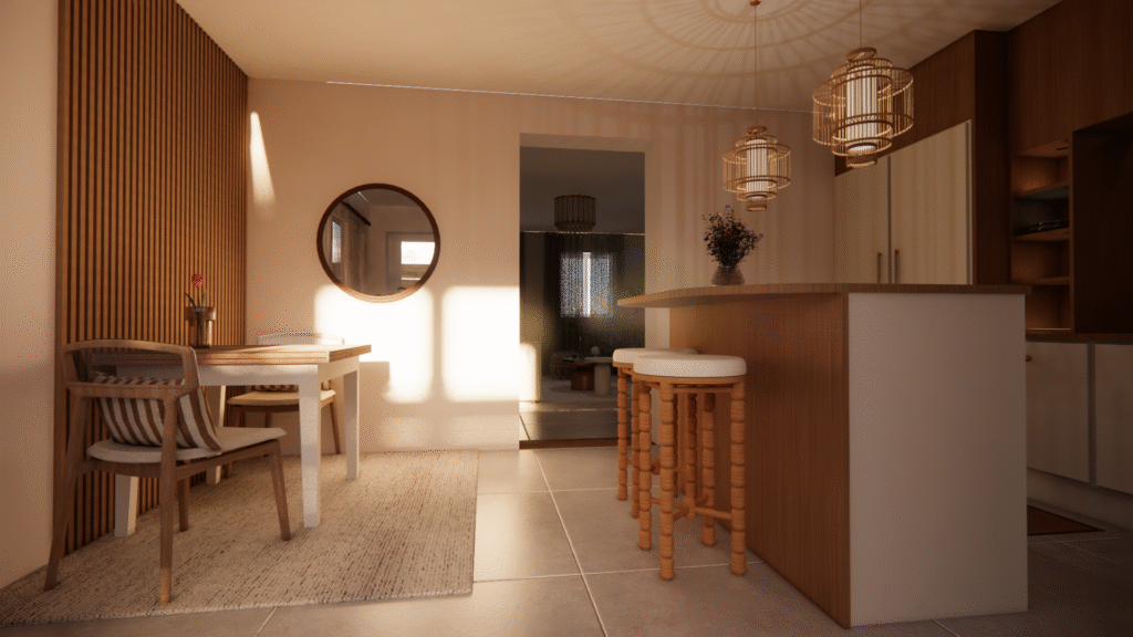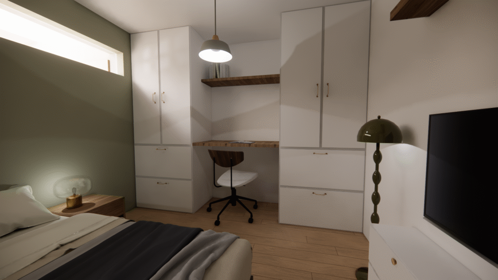 Ce projet portait sur un T1 de 30 m² nécessitant une rénovation complète, avec des volumes difficiles à percevoir pour un futur acheteur ou locataire. J’ai créé des visuels 3D et un aménagement optimisé, mêlant praticité et esthétique, pour aider le client et ses futurs acquéreurs à se projeter dans un espace fonctionnel et chaleureux.