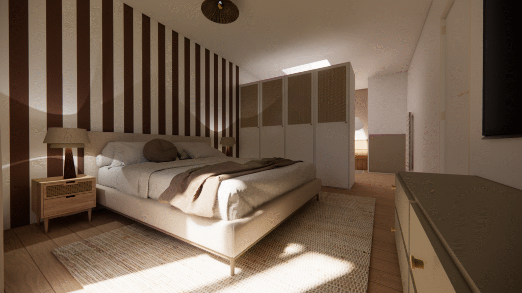 La salle de bain sous la mezzanine a été préservée, et un escalier sur mesure avec rangements intégrés optimise l’espace disponible. Une isolation complète a été réalisée pour garantir le confort thermique. L’ensemble a été modélisé en 3D afin de visualiser les volumes, les connexions et d’offrir une solution esthétique et adaptée aux besoins du client.