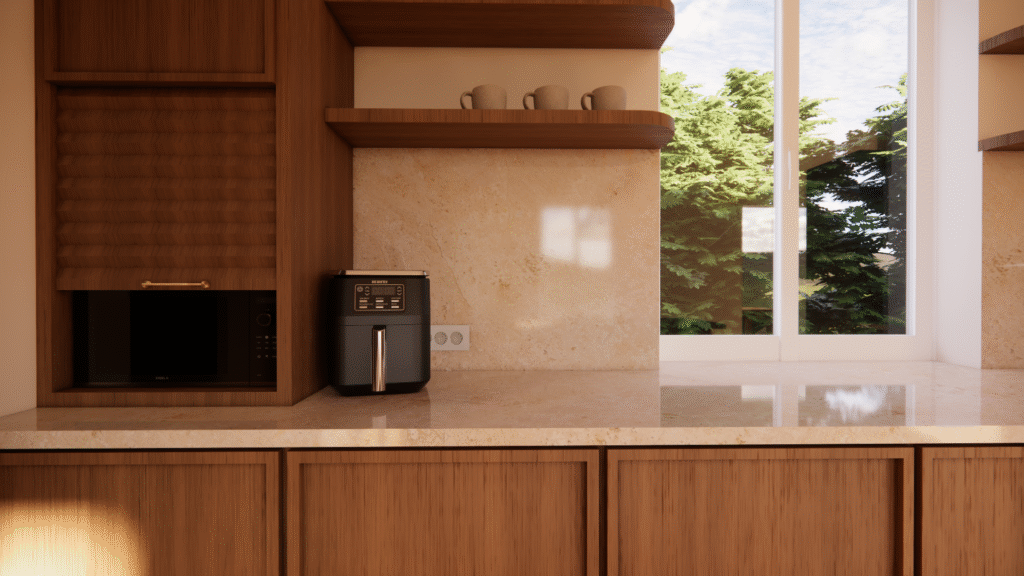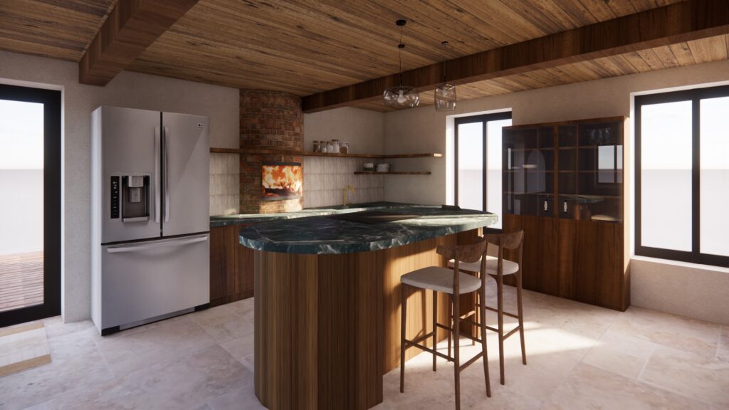 Mes clients souhaitaient moderniser leur ancienne cuisine tout en conservant la cheminée en brique. En m’appuyant sur leurs inspirations, j’ai conçu une cuisine sur mesure mêlant bois, pierre naturelle et éléments en brique. L’ensemble a été modélisé en 3D pour valider l’ambiance et l’ergonomie avant travaux.
