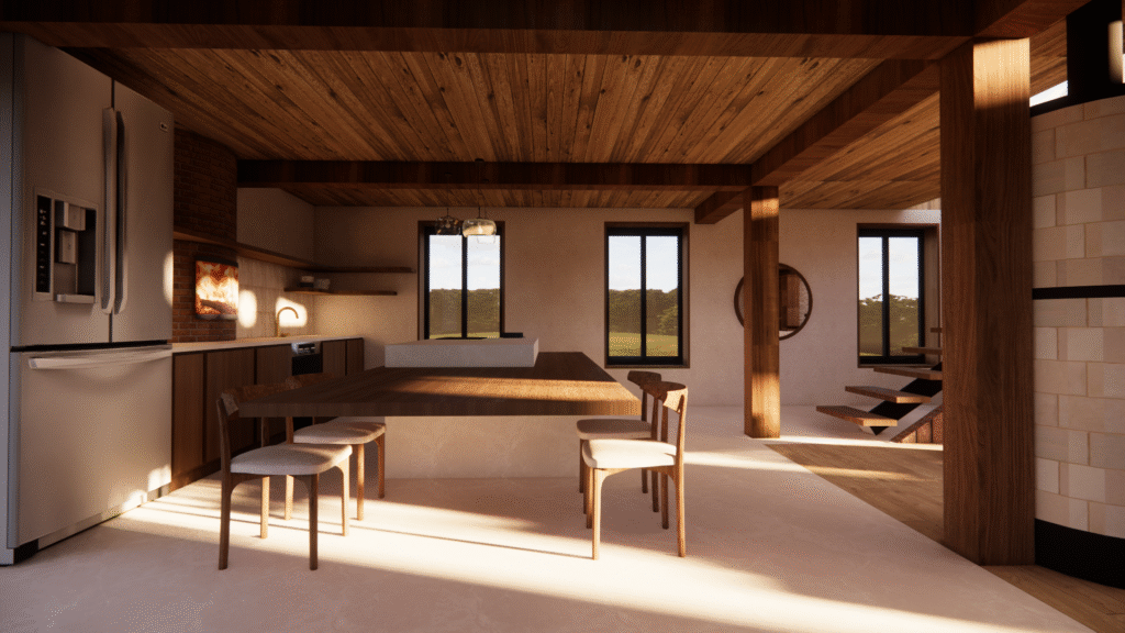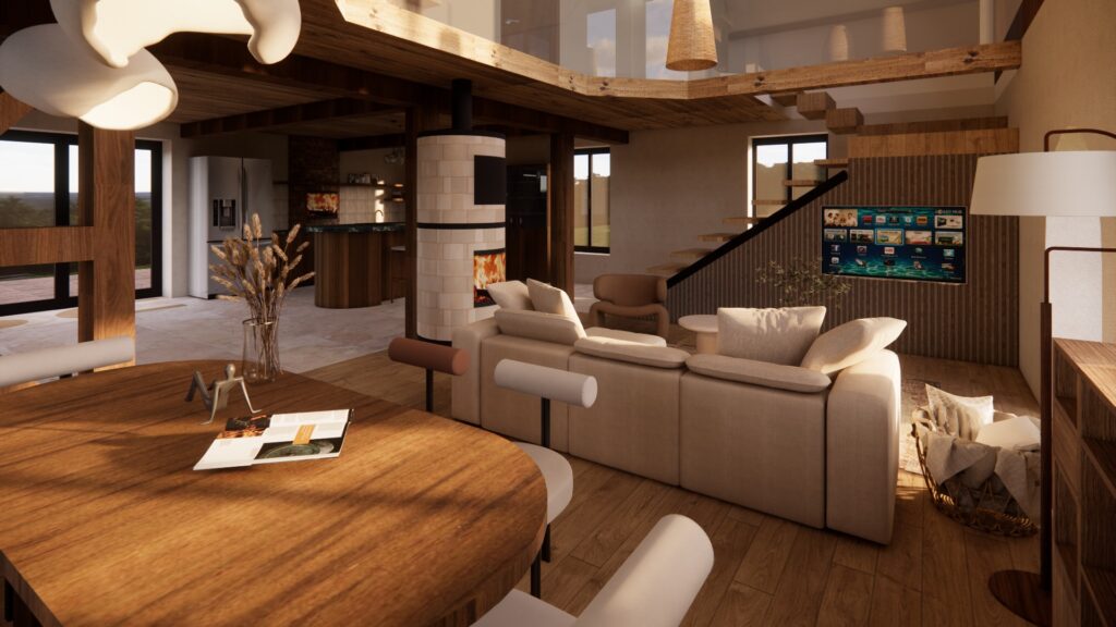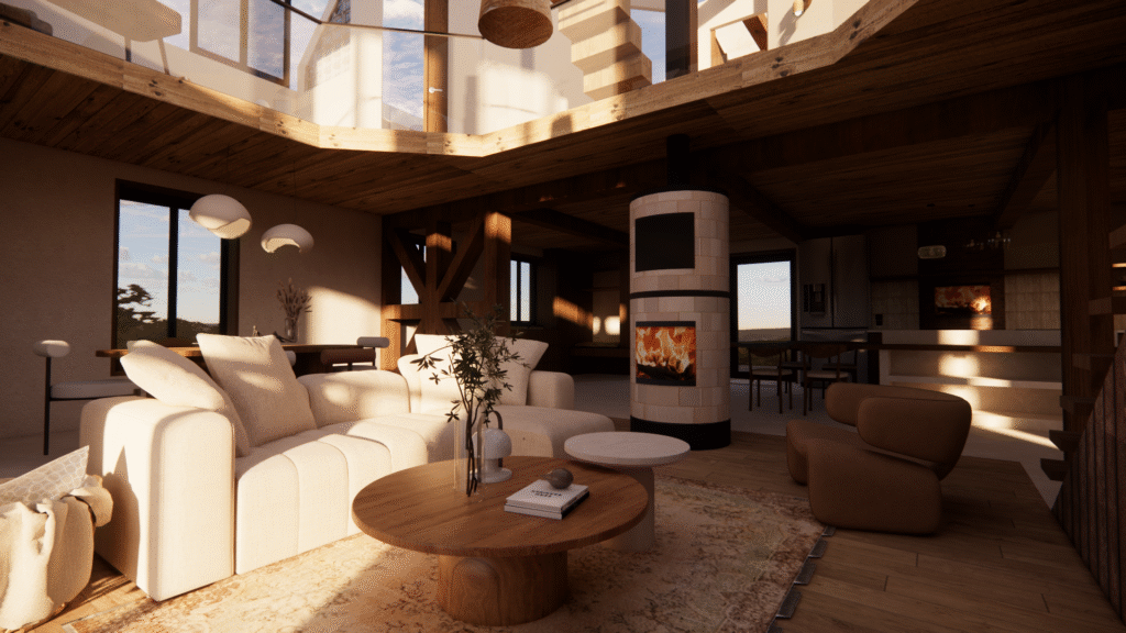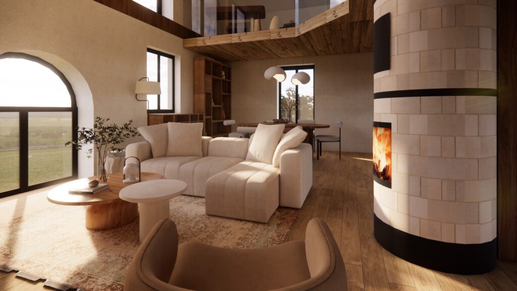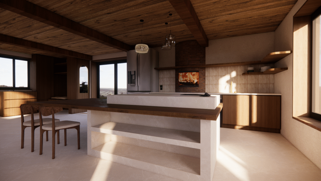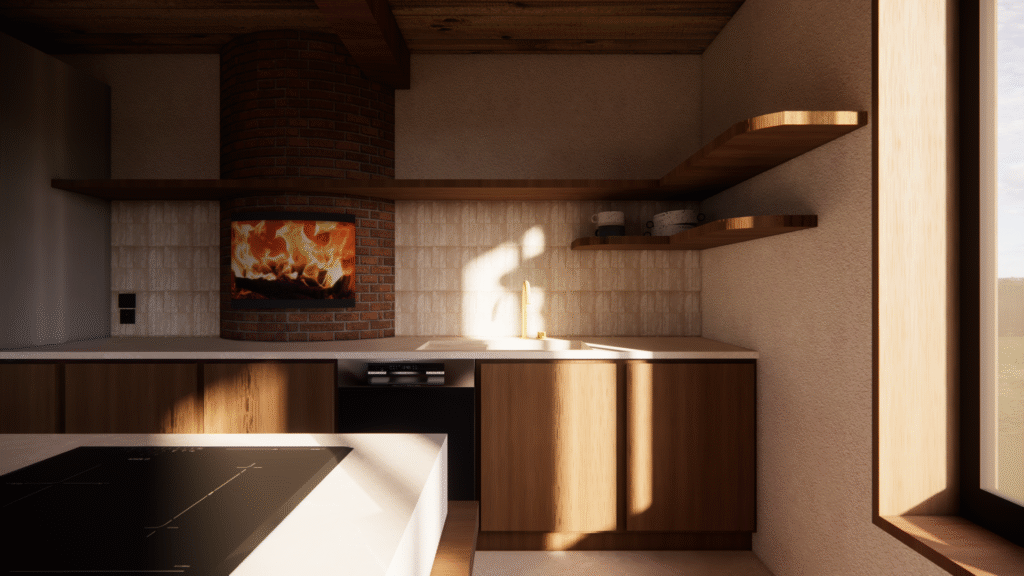 ​Projections 3D de l’intérieur d’un ancien moulin en rénovation, intégrant le poêle, la cuisine et les aménagements souhaités afin de visualiser la disposition et l’ambiance des espaces. Deux options d’aménagement ont été proposées pour la cuisine, permettant de comparer les implantations et de valider le choix le plus adapté au projet.